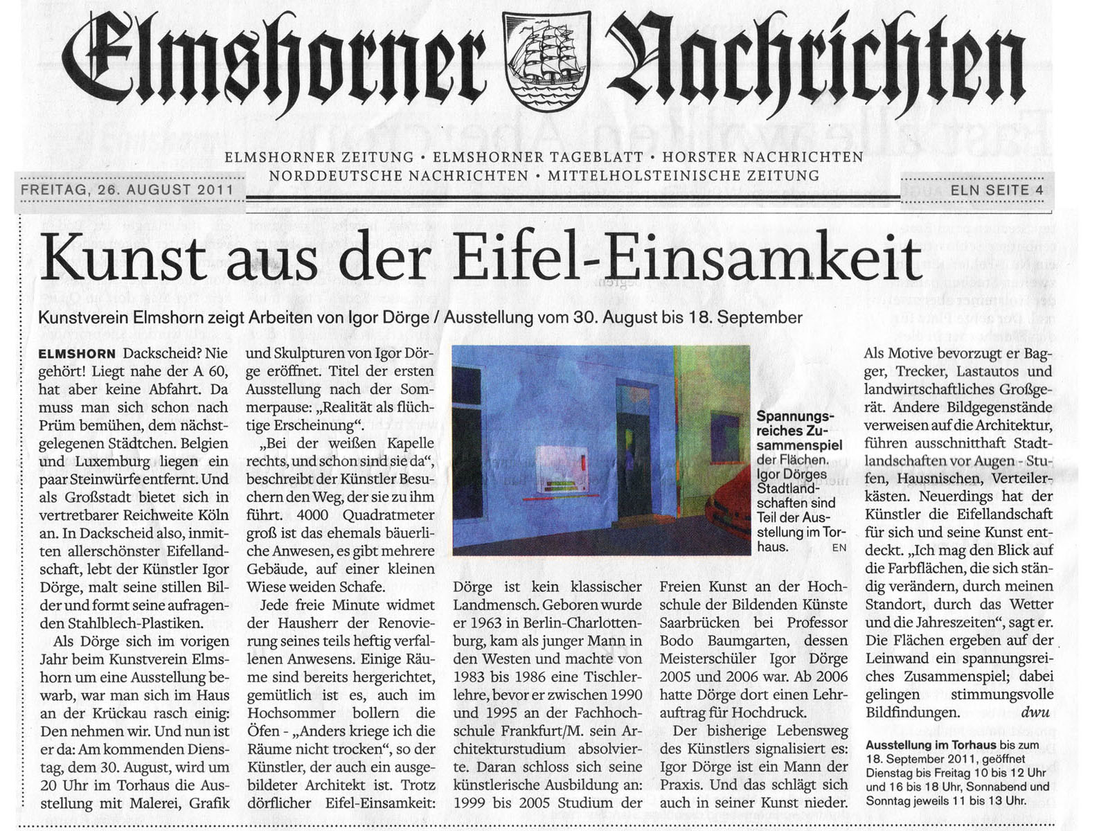 Am Rande der Eifel, in Dackscheid - Luxemburg und Belgien sind nicht weit - sitzt Igor Dörge in ländlichem Umfeld und bringt seine nicht selten technisch ausgerichteten Motive auf die Leinwand. Wir sehen Lastautos, Trecker, Bagger, schweres Bau- und Erntegerät. Dieser Künstler muss ein Pragmatiker sein. Neuerdings rücken auch Landschaften in den Vordergrund. "Ich mag den Blick auf die Farbflächen, die sich durch meinen Standort ständig verändern, ich mag das Wetter und die Jahreszeiten", sagt Dörge, der von Geburt ein Großstädter ist. 1963 erblickte er in Berlin-Charlottenburg das Licht der Welt. Er machte zunächst eine Tischlerlehre und studierte von 1990 bis 1995 Architektur an der Fachhochschule Frankfurt am Main. Von 1999 bis 2005 schloss sich ein Studium der Freien Kunst an der Hochschule für Bildende Künste Saar in Saarbrücken an. Prof. Bodo Baumgarten war sein Lehrer, 2005/2006 war Igor Dörge dessen Meisterschüler. 2006 -2010 hatte er einen Lehrauftrag an der Hochschule für Bildende Künste Saar.